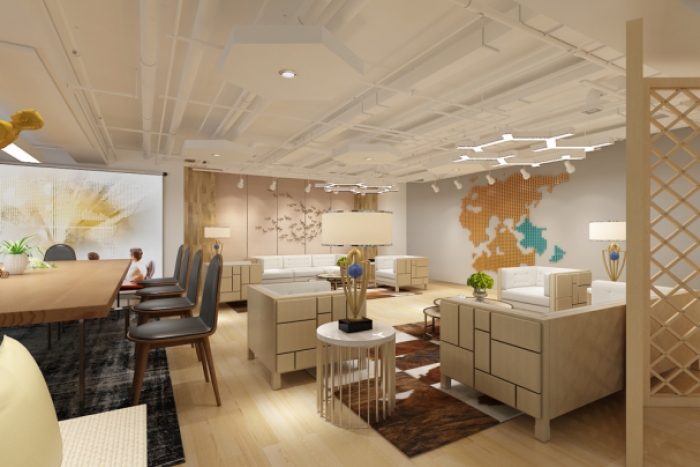 整个办公空间的设计以高档、奢华新中式为主要风格,新中式是为了突破古典中式的沉闷感而衍生的,它结合了现代的大理石,也更追求舒服耐用。在保留古色古香的栅格元素的同时,也更加强调灯光的运用,以及家具的柔软度,给人一种恰到好处的温和感。