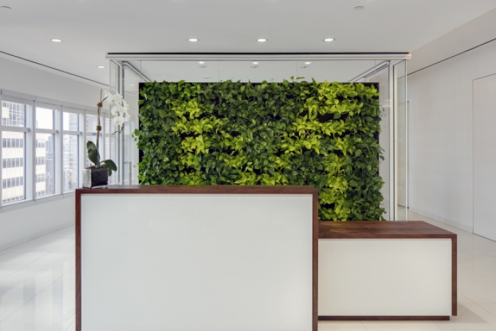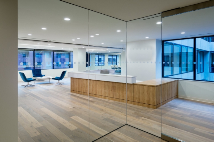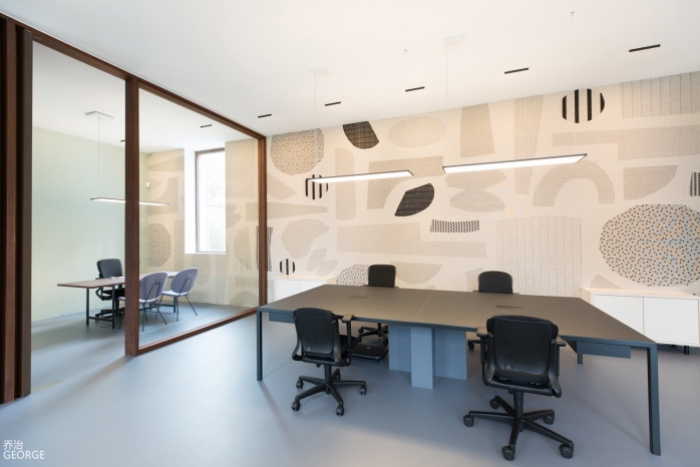 本办公室装修设计时,设计师大量采用了现代手法,大面积的使用浅色木饰面、素色墙布,另外加了一些玻璃砖及石材做点缀,整个空间更加清爽,自然。