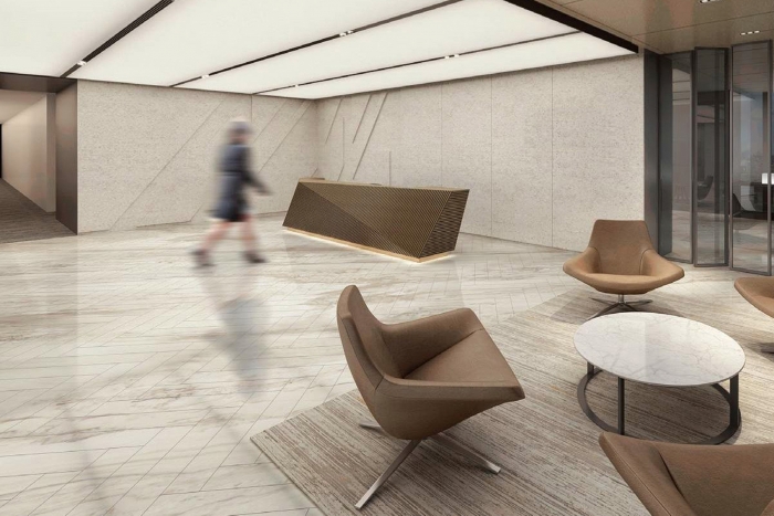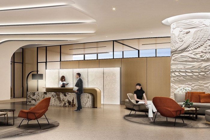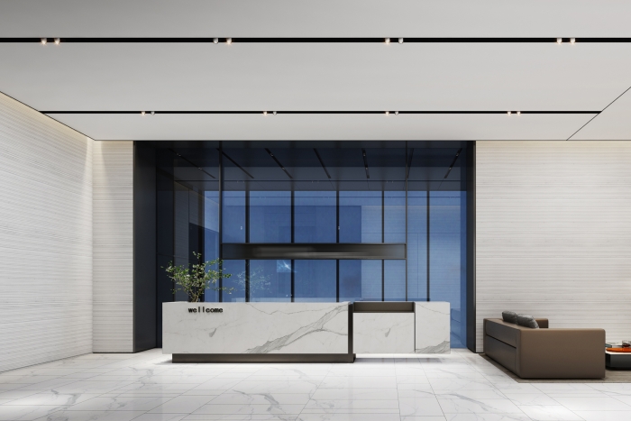本案从整体设计来看,恢弘大气,功能齐全,布局严谨;从装饰主材上看,本案大量使用了大理石饰材,质感鲜明,效果突出,给人以高端大气之感;从风格上来讲,本案是典型的现代办公室设计风格。
