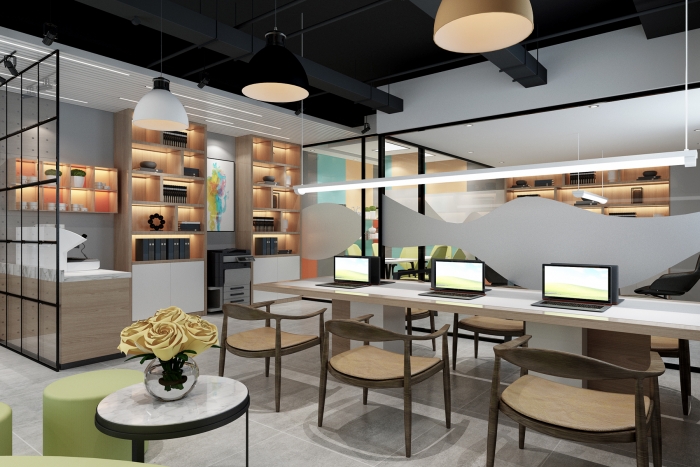 该案例总面积达到7000平,设计风格定位为现代简约型。简约风格这几年逐渐成为办公室装修的主流。它注重线条简洁、色调温和,给人带来简单、舒适、自然、高品质的感觉。工作台和柜子的采用简洁设计,用统一的颜色调和它们之间的关系。此外,设置一些以木质为基础的装饰品来提升整体感受。